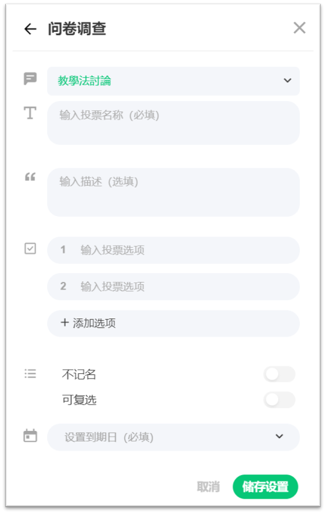 2. 输入投票名称、投票选项、截止日期及欲发布的议题。问卷调查叙述、其他设定及更多投票选项为选填栏位。