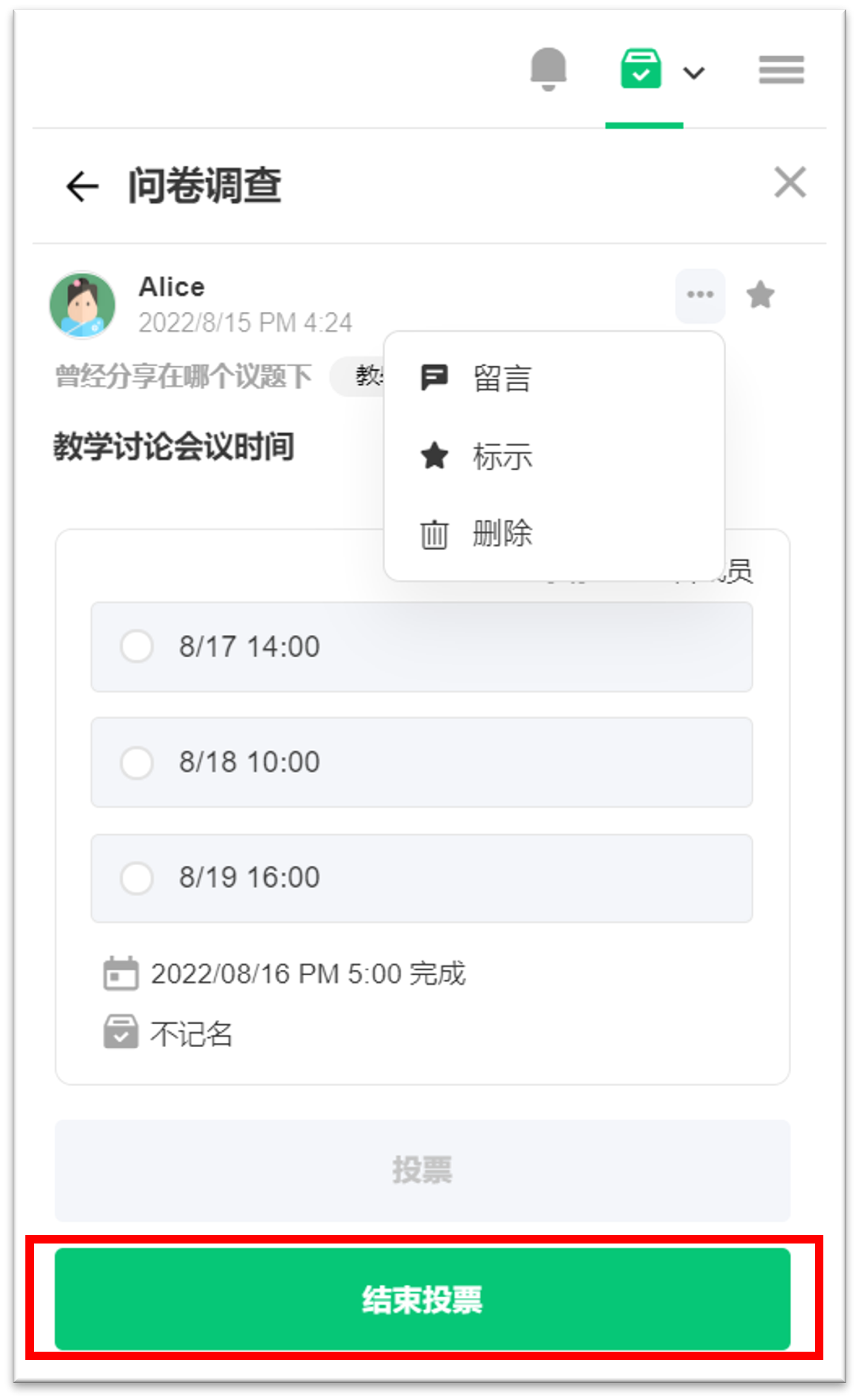 结束问卷调查:当问卷调查已经完成,您可以提前结束问卷调查。