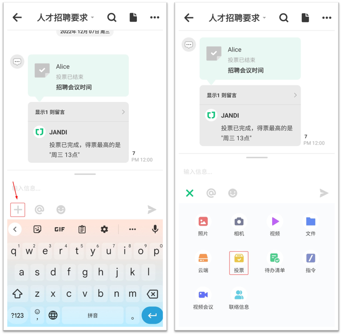 或是在讯息栏下方选择 [问卷调查] 以在 JANDI 建立新投票。
