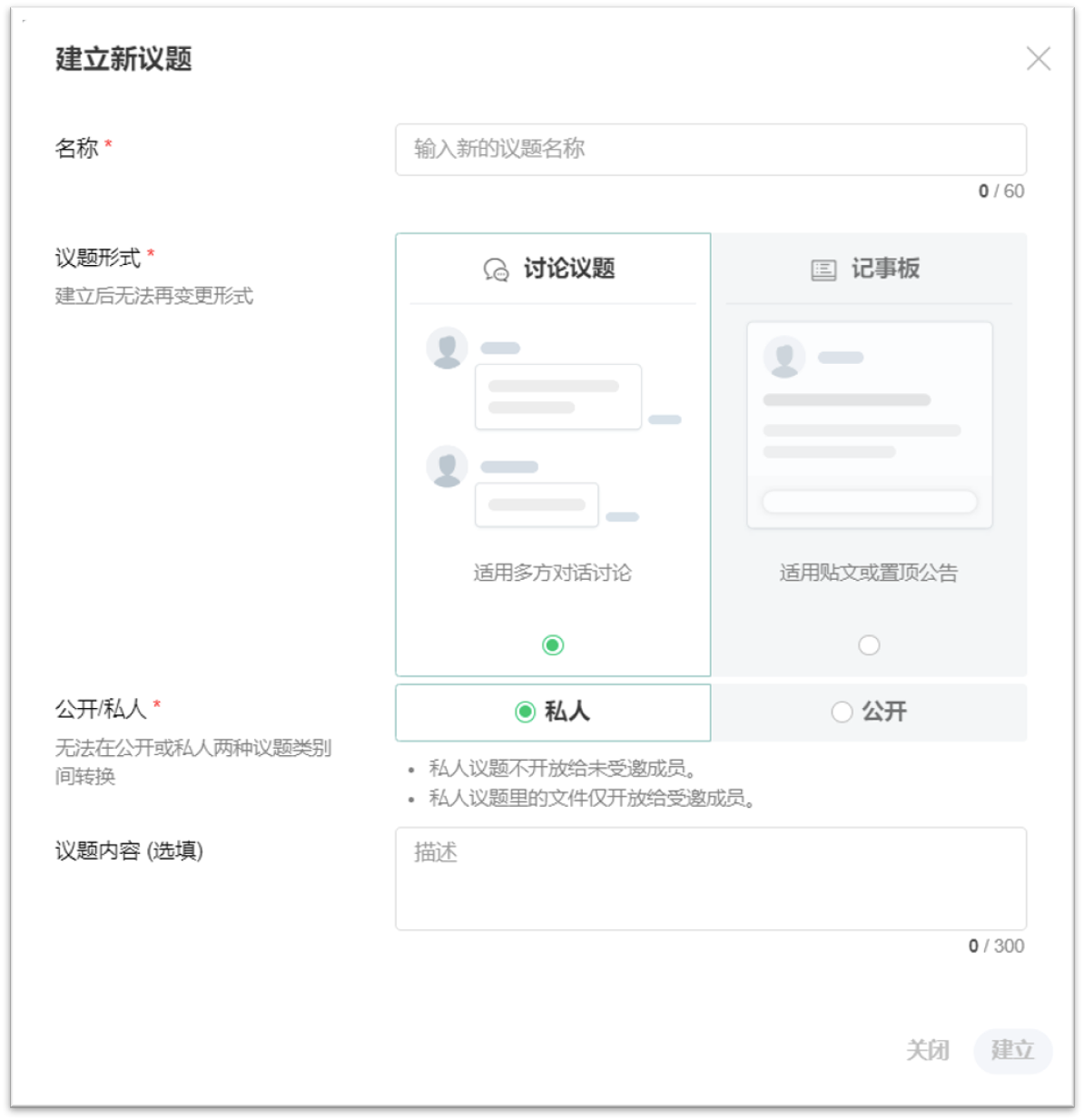 *所有团队成员皆可以建立议题,为您的工作任务建立任何议题。(仅准成员无法建立议题。)<网页版/电脑版>1. 于 JANDI 界面中选择左侧的议题栏位的 (+),点击 [建立新议题]。2. 于建立议题页面输入相关信息议题名称议题形式讨论议题记事板议题议题类型所有成员皆可自由加入并浏览公开议题。仅受邀成员可加入私人议题。✔️ 一旦确定建立议题,将无法变更议题类型。议题内容进阶快捷自动邀请正成员若设置自动邀请,包含新加入的成员内,所有正成员将会被自动邀请进入议题。<手机版>在议题右侧 (+) 建立新议题,选定议题形式与议题类型 (公开/私人)。