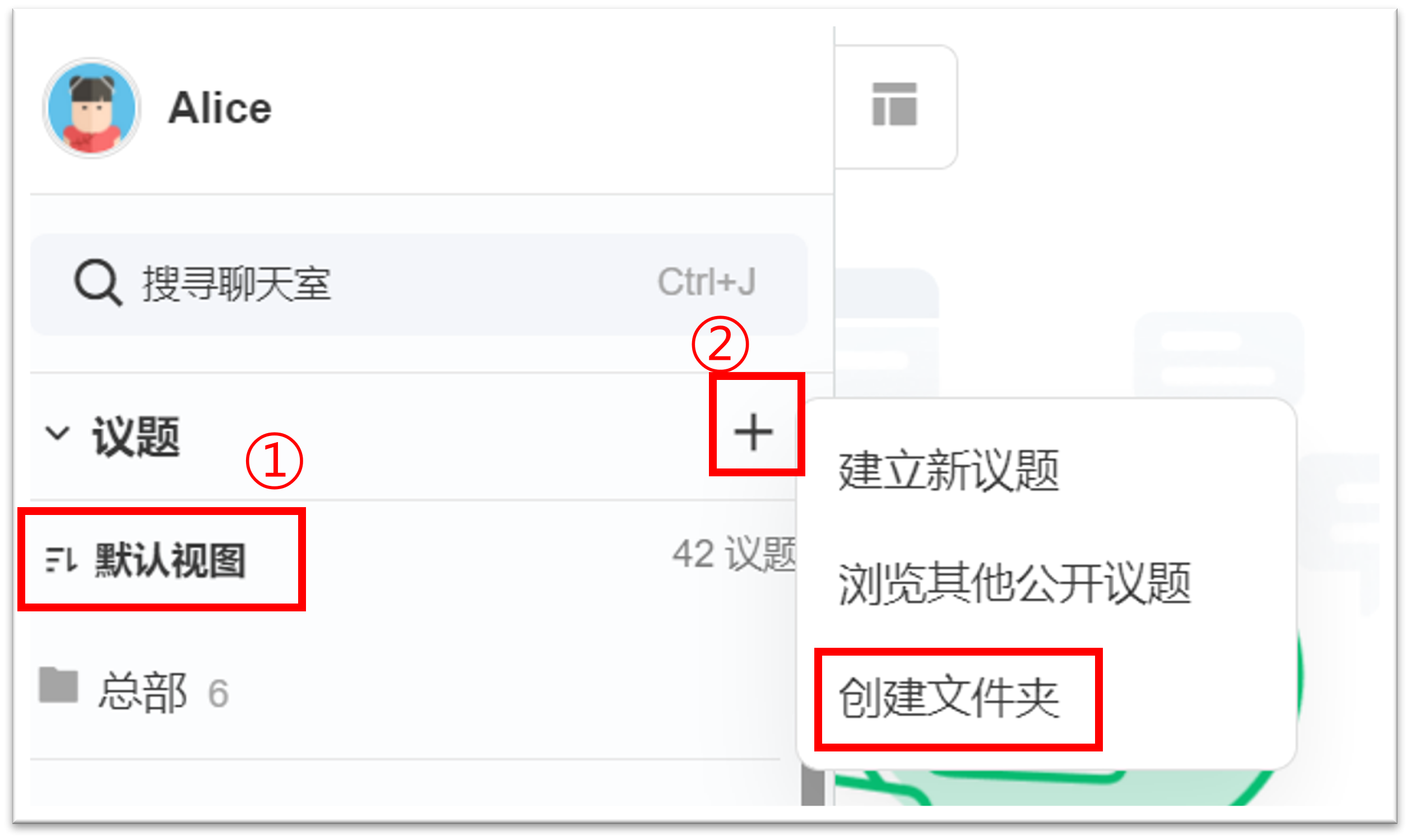 <网页版/电脑版> 1. 点选在议题列表上方的 [默认视图],可选择按照 [名称] 排序;点击右侧的 [+] 选择 [创建文件夹]。