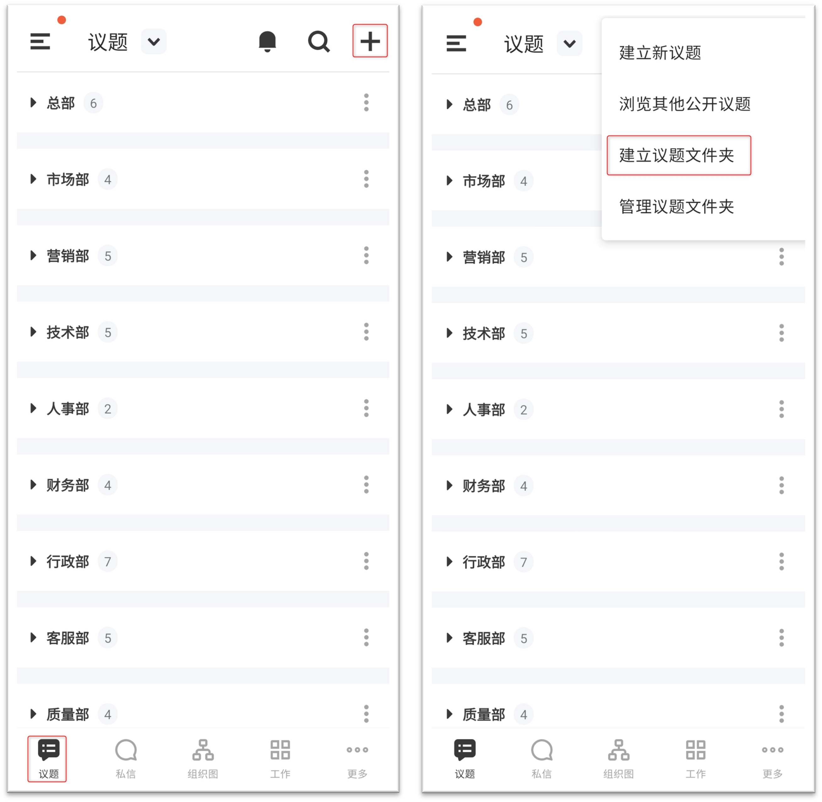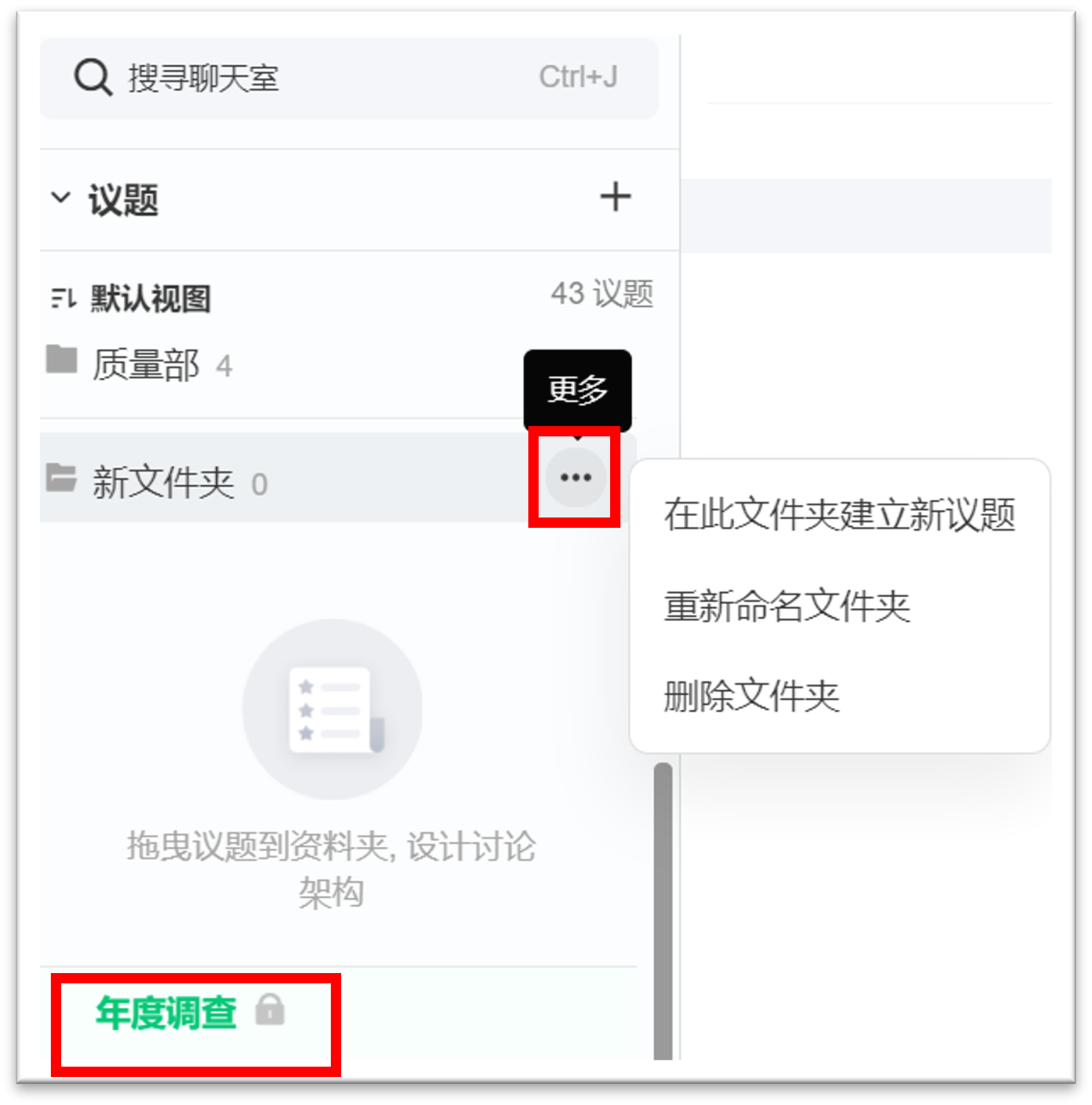 若您参与多个议题讨论,为方便管理个人查找及改善工作方式,可以利用建立议题文件夹来归纳同类型的议题讨论。