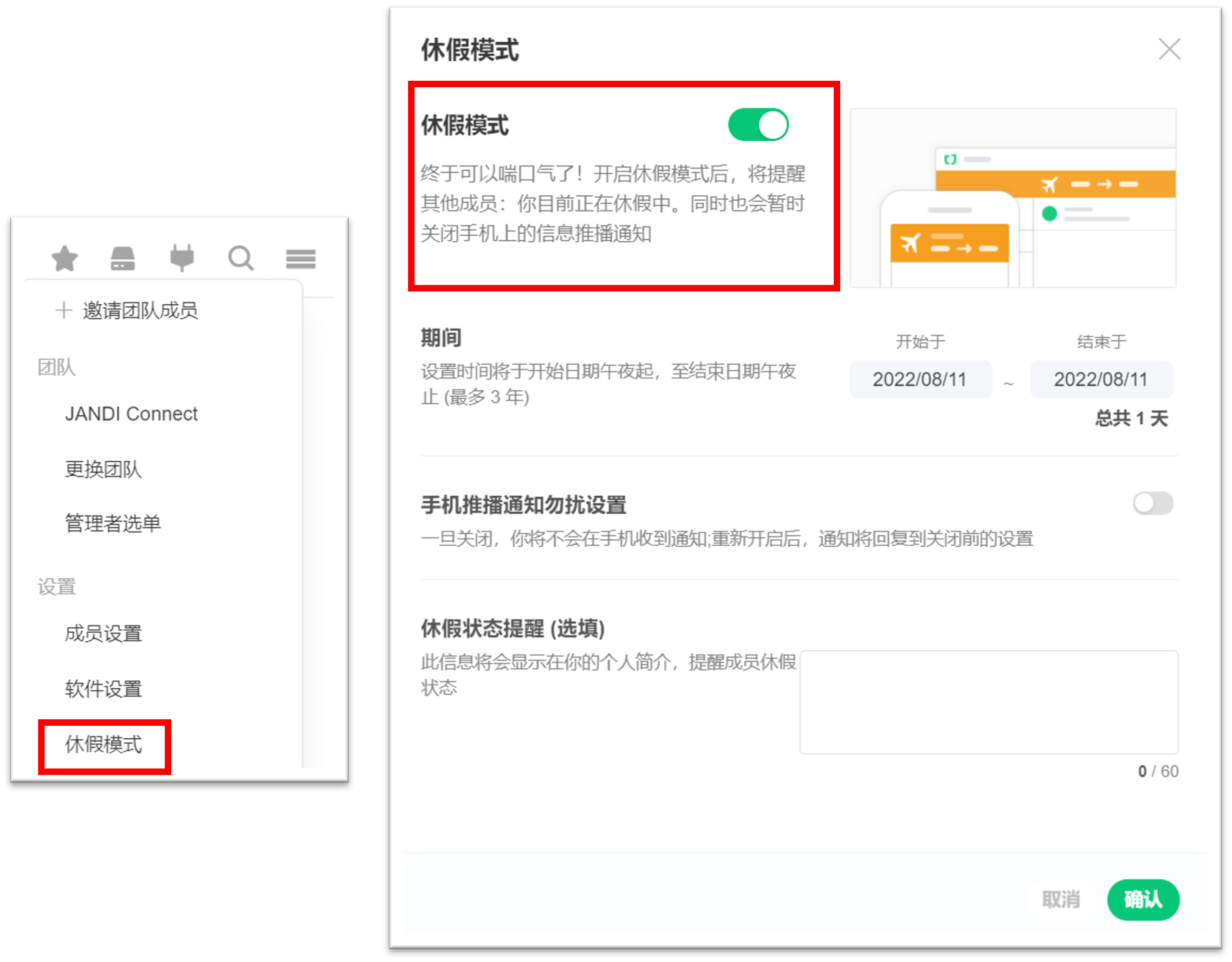 启用 JANDI 休假模式,如此一来,所有成员都能知道您正在享受假期中。