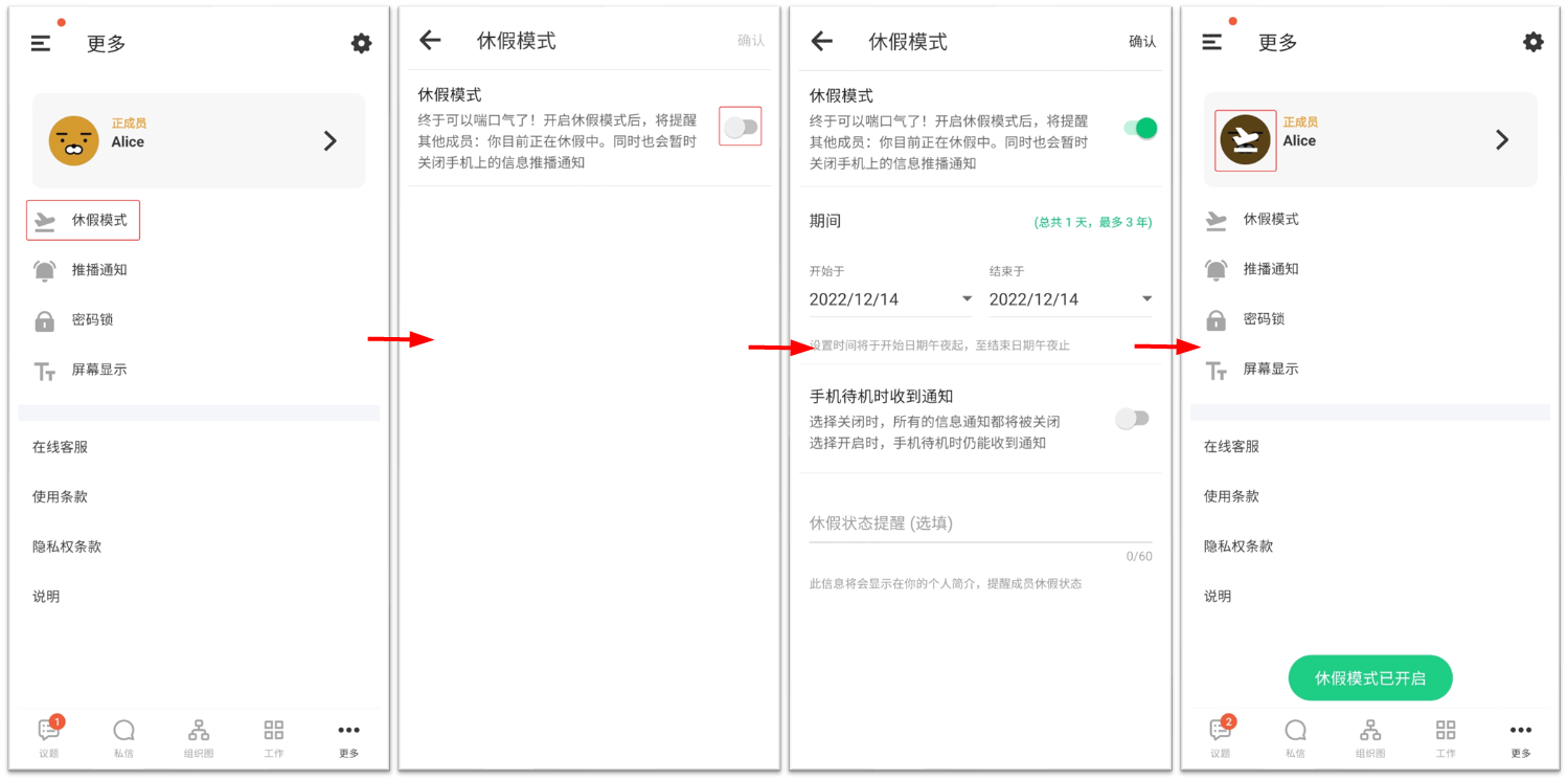 1. 于介面下方 [...]更多,选择休假模式。开启休假模式,选择休假日期。