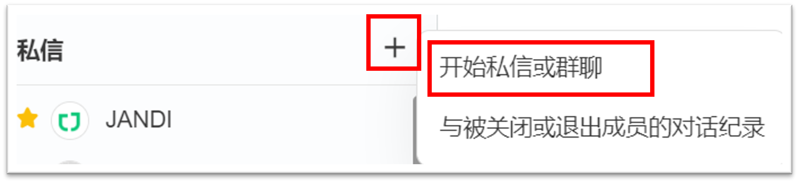 1. 于私信列表右上方点击 (+),并选择 [开始私信或群聊]。