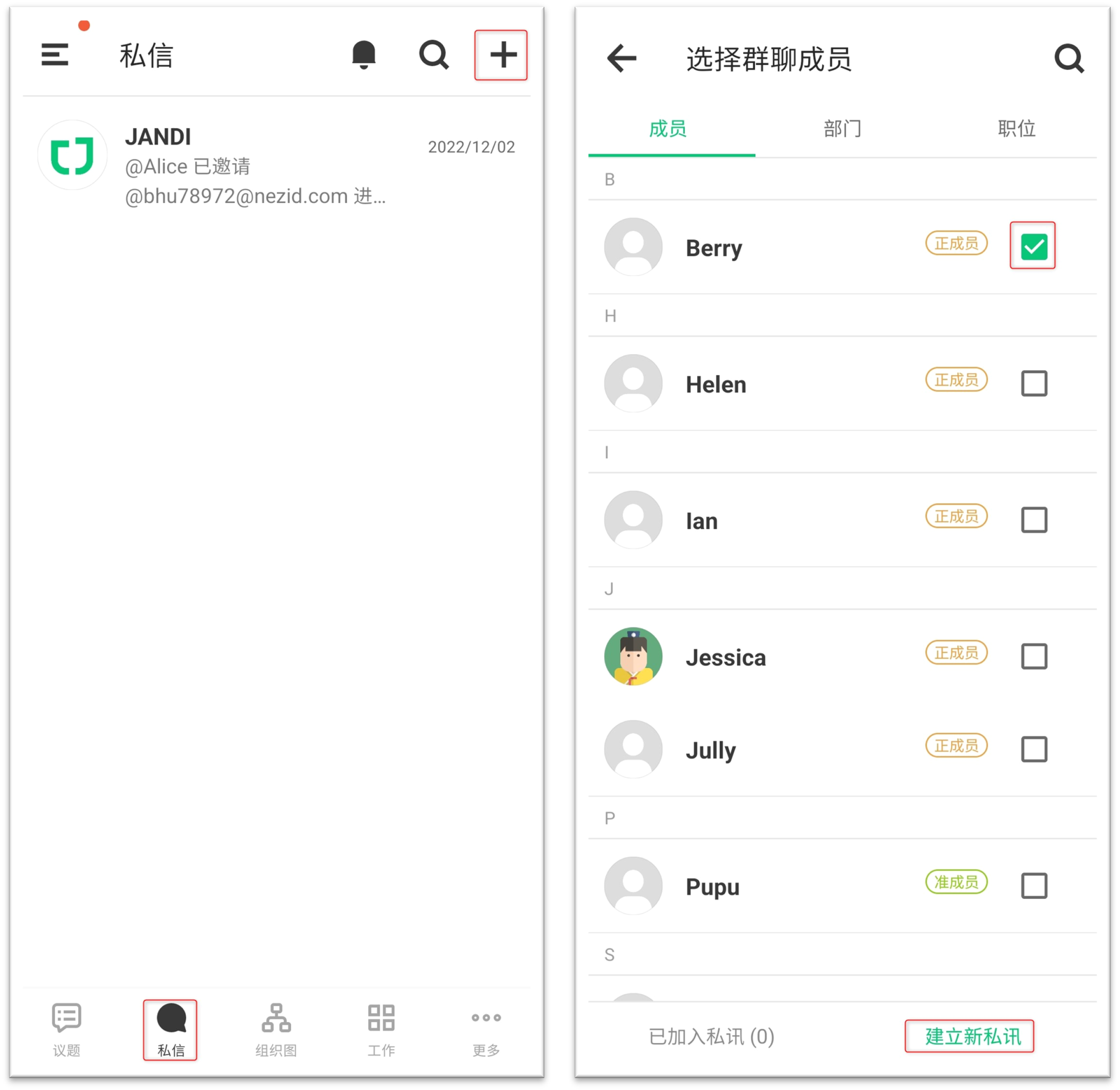 1. 于私信列表右上方点击 (+),并选择 [开始私信或群聊]