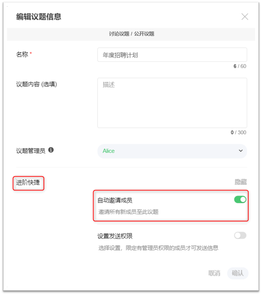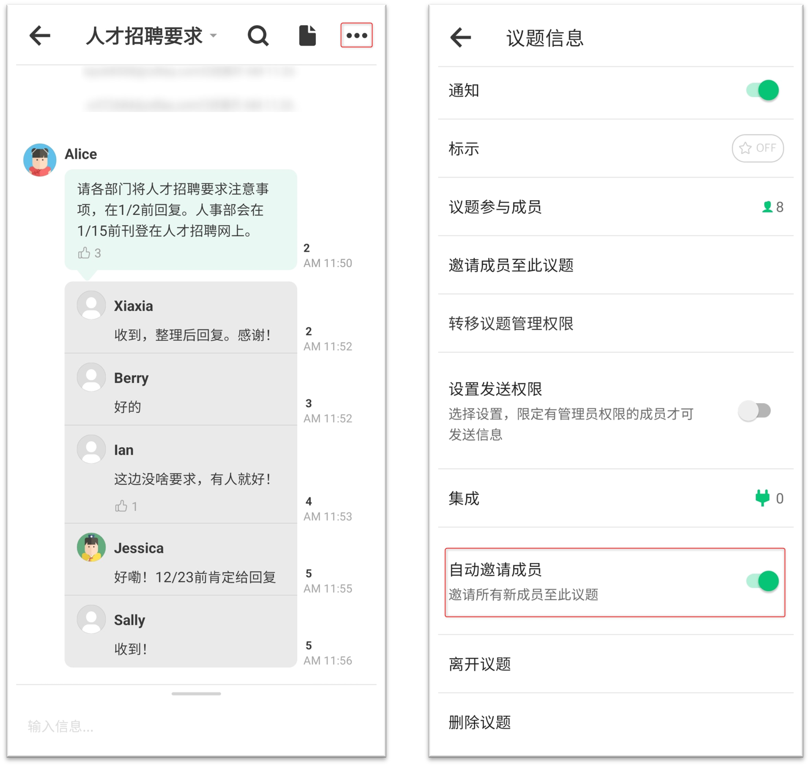 选择议题右上角的 [...] 图示,开启 [自动邀请成员]。
