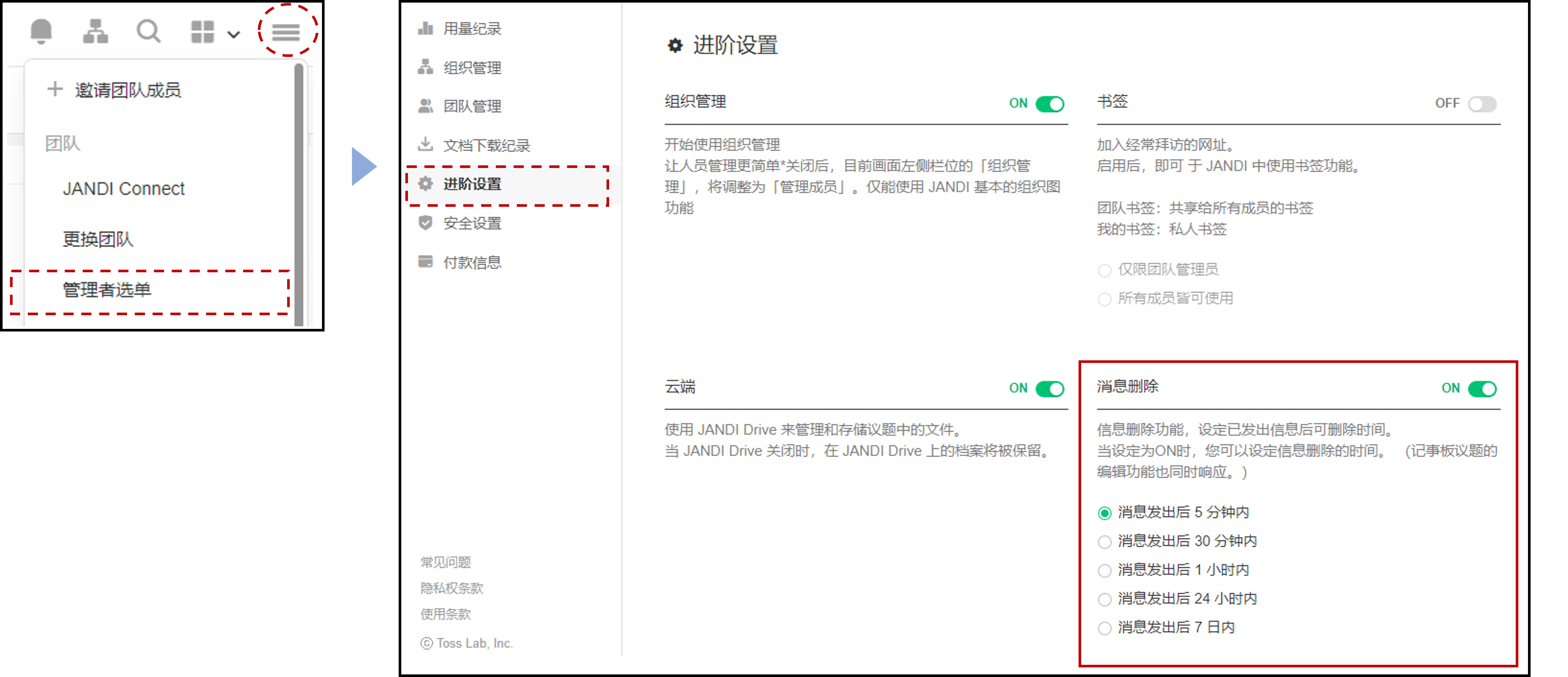通过设置消息删除时间,您可以设置团队内的消息在指定的时间内可被删除,而超过时间则无法删除。 (记事板议题的编辑功能也同时响应。)