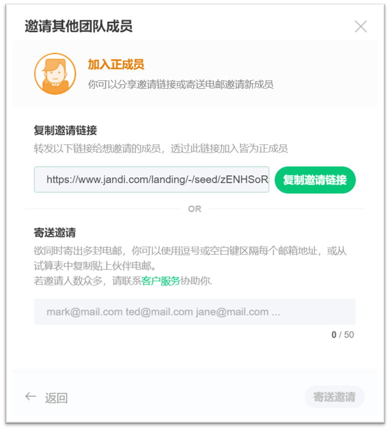 若您想同时邀请多位成员,请通过复制邀请链接并以电子邮件或其他通信软件发送给成员。