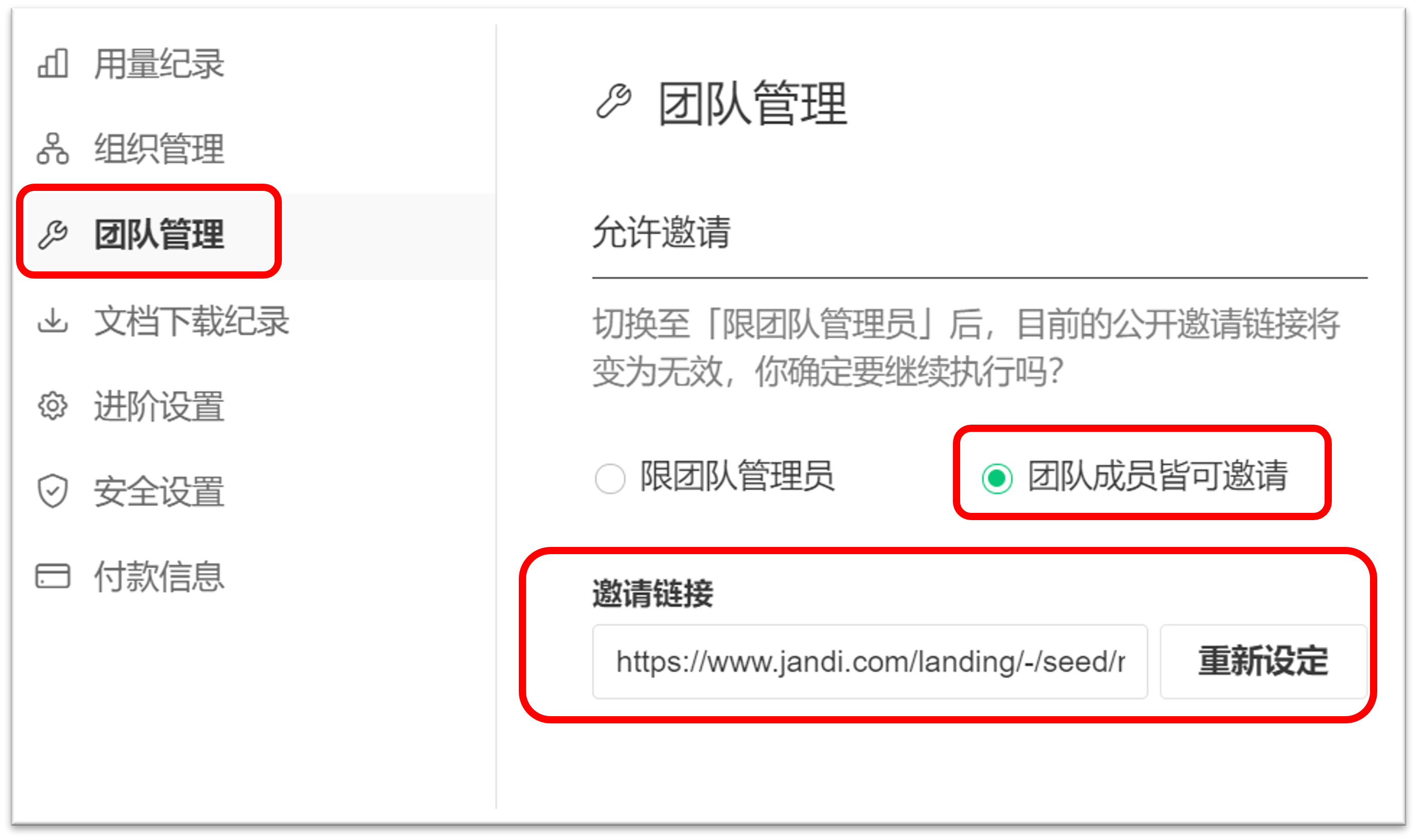 4. 然而,若您的团队管理者关闭邀请设定,成员将无法邀请其他人员加入团队。请向您的团队管理者询问于进阶设定中的 [允许邀请] 选择 [团队成员皆可邀请]。