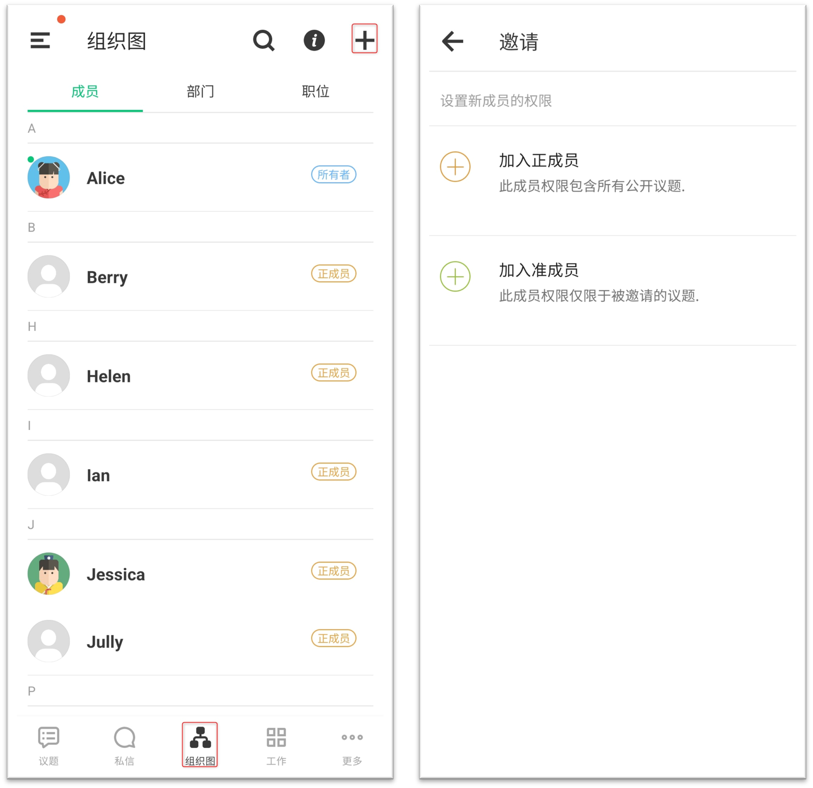 于界面下方选项 [组织图] 选择 右上方的 (+) 图示以邀请正成员或准成员。