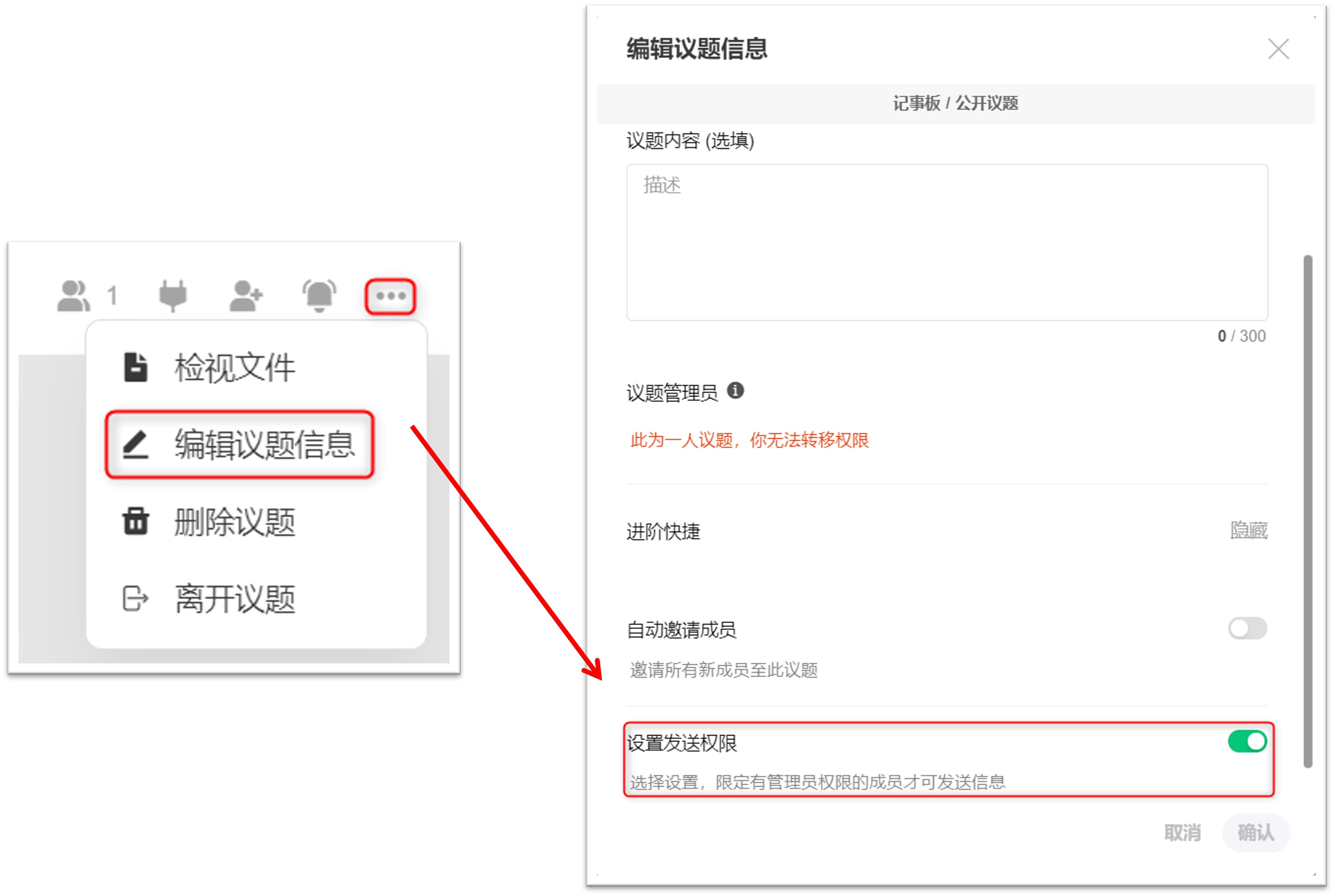 1. 进入议题右上角,选择 [···] 图示。然后选择 [编辑议题信息],只有议题管理员可以编辑有关议题的信息。 2. 弹出 [编辑议题信息] 视窗后,点开 [进阶快捷] 并打开 [设置发送权限]。