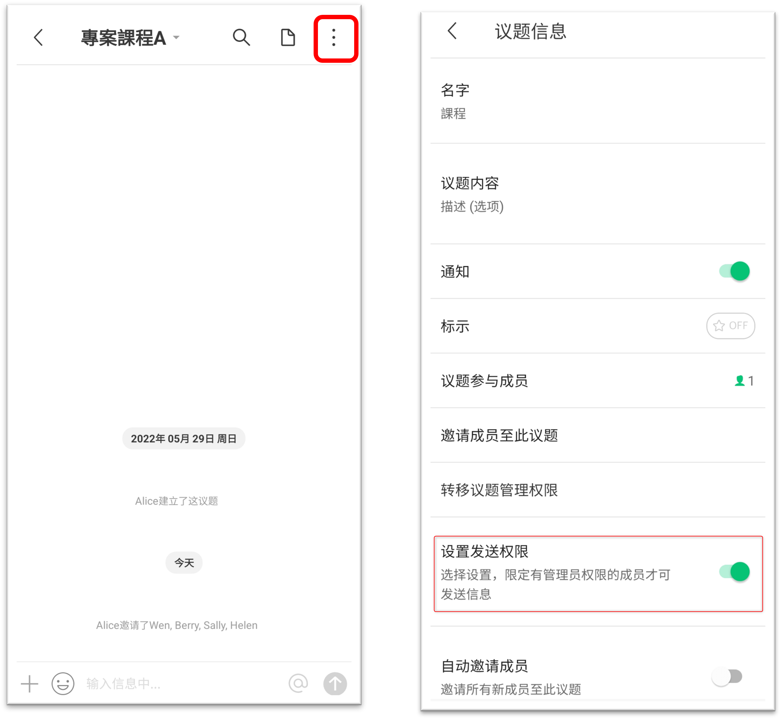 点击议题右上角的 [≡] 图示,开启 [设置发送权限]。