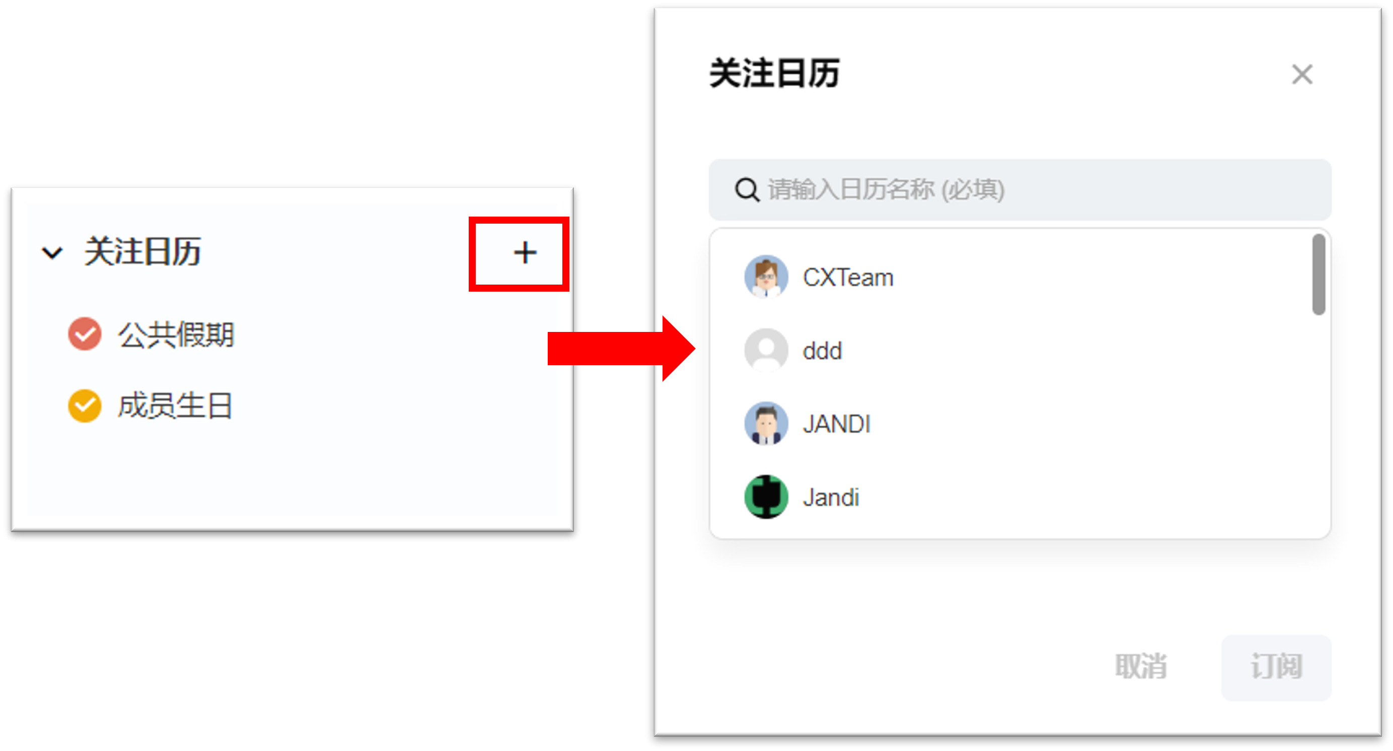 我的日历是由预设日历与团队日历组成的;关注日历将会自动显示公共假期与成员的生日。