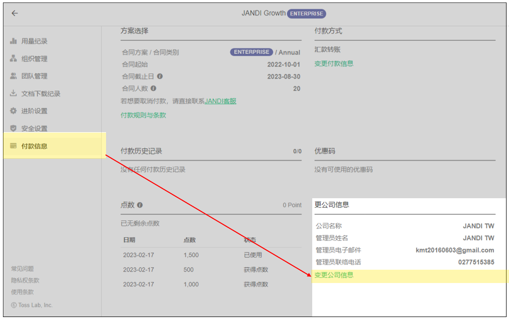 桌机版本操作方式:JANDI 右上角[三] > [管理者选单] > [付款信息] > [公司信息]