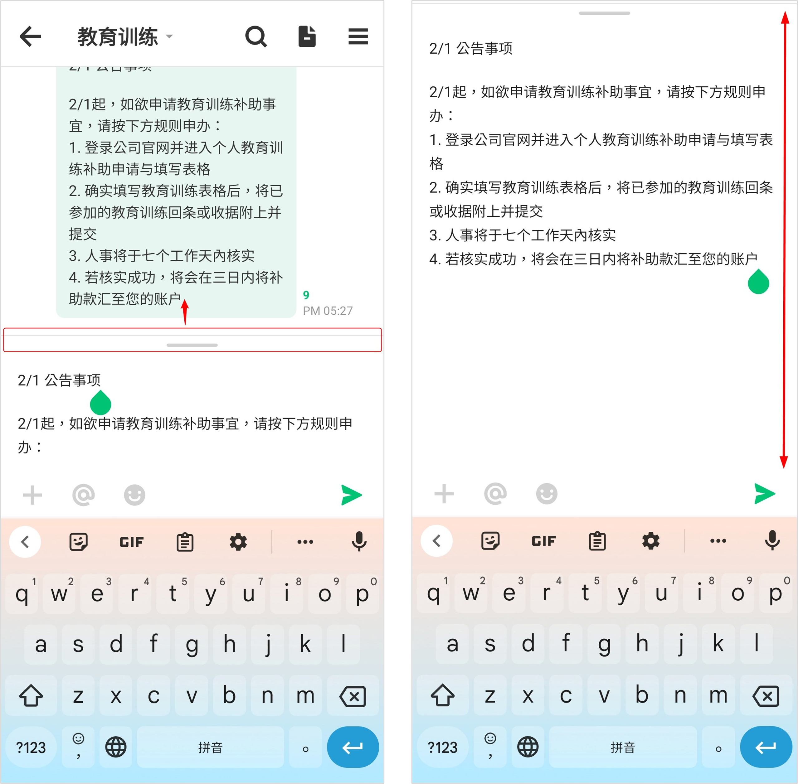 当在手机上编辑信息时,总是因为输入框太小,而不易输入并查看内容吗?现在可以将信息输入框展开来,让您在编辑信息时,能更一目了然地查看所编辑的内容。在信息输入框上方,可以看见中段横线,请将此横线往上滑动。往上滑动横线后,信息输入框将会往上展开。