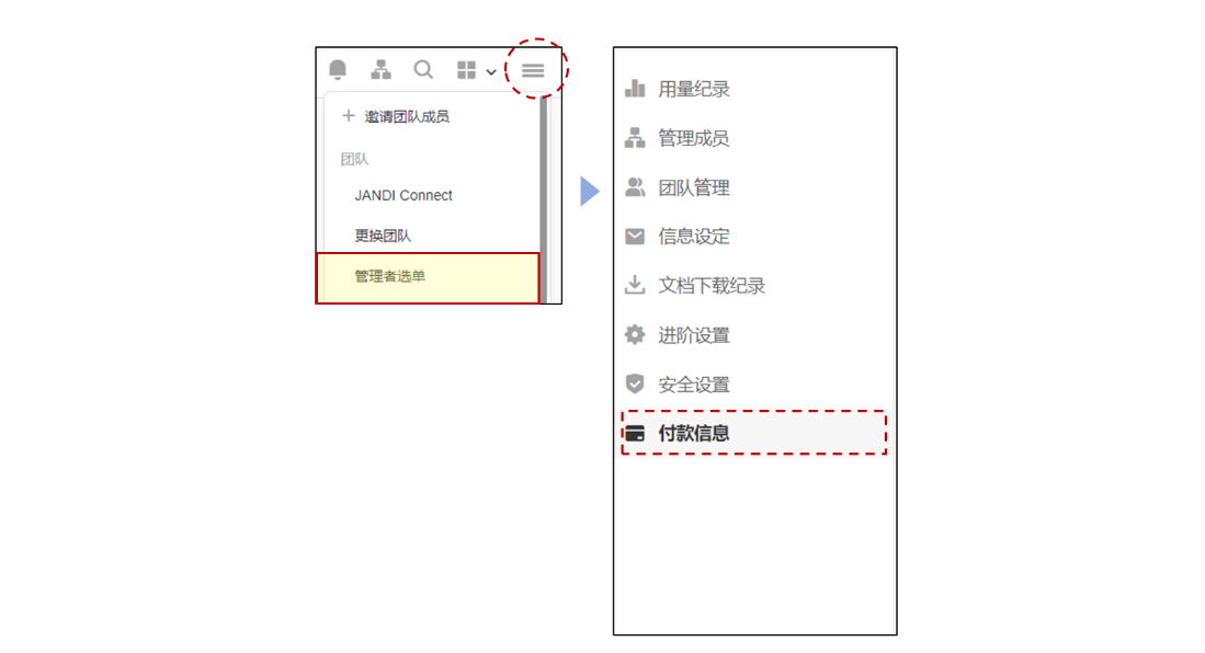 JANDI右上角 [≡] >点击 [管理者选单] >[付款信息]