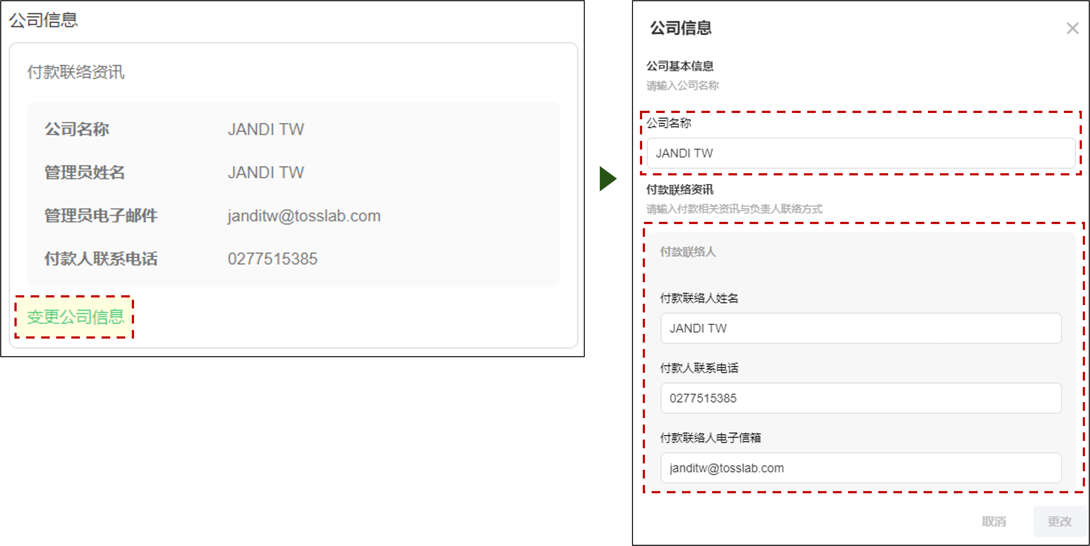 付款信息 > [公司信息] >[變更公司信息]