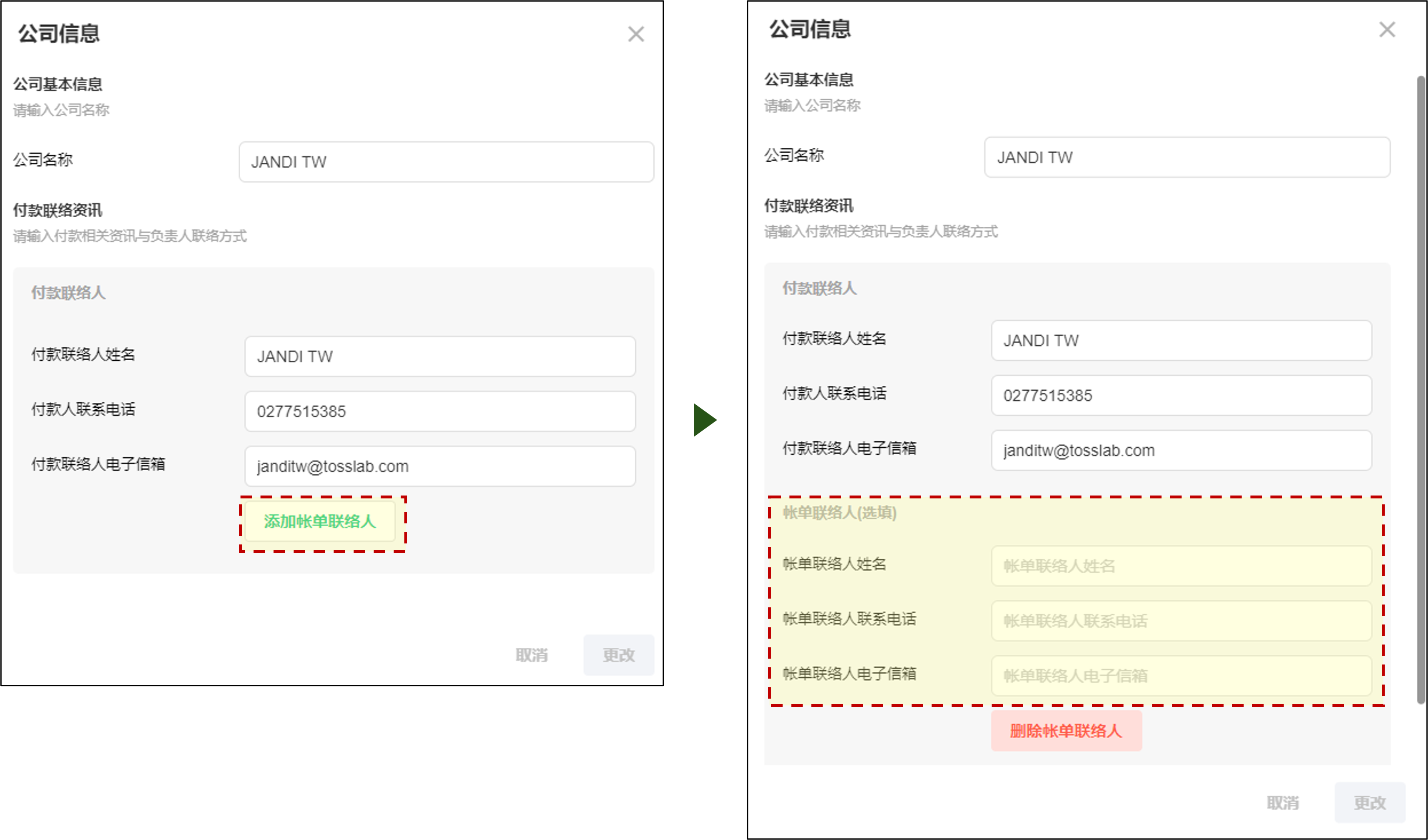 💡操作方式:付款信息 > [公司信息] >[变更公司信息] > [添加帐单联络人]