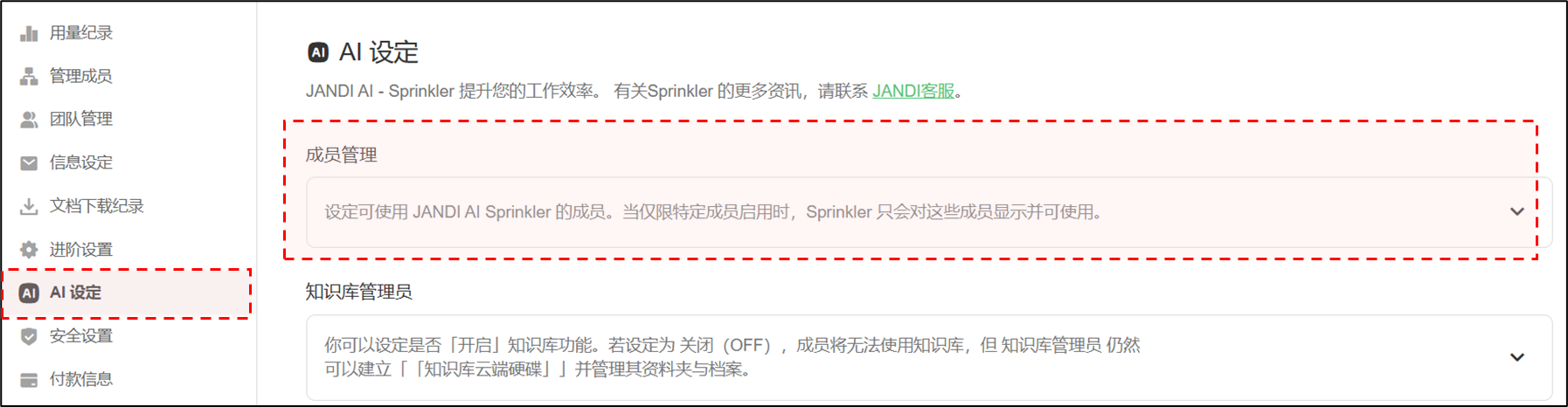团队所有者 或 团队管理员 可以设定特定成员可以使用 JANDI AI Sprinkler。当设定为仅特定成员可用时,Sprinkler 只会显示并提供给这些指定成员使用。