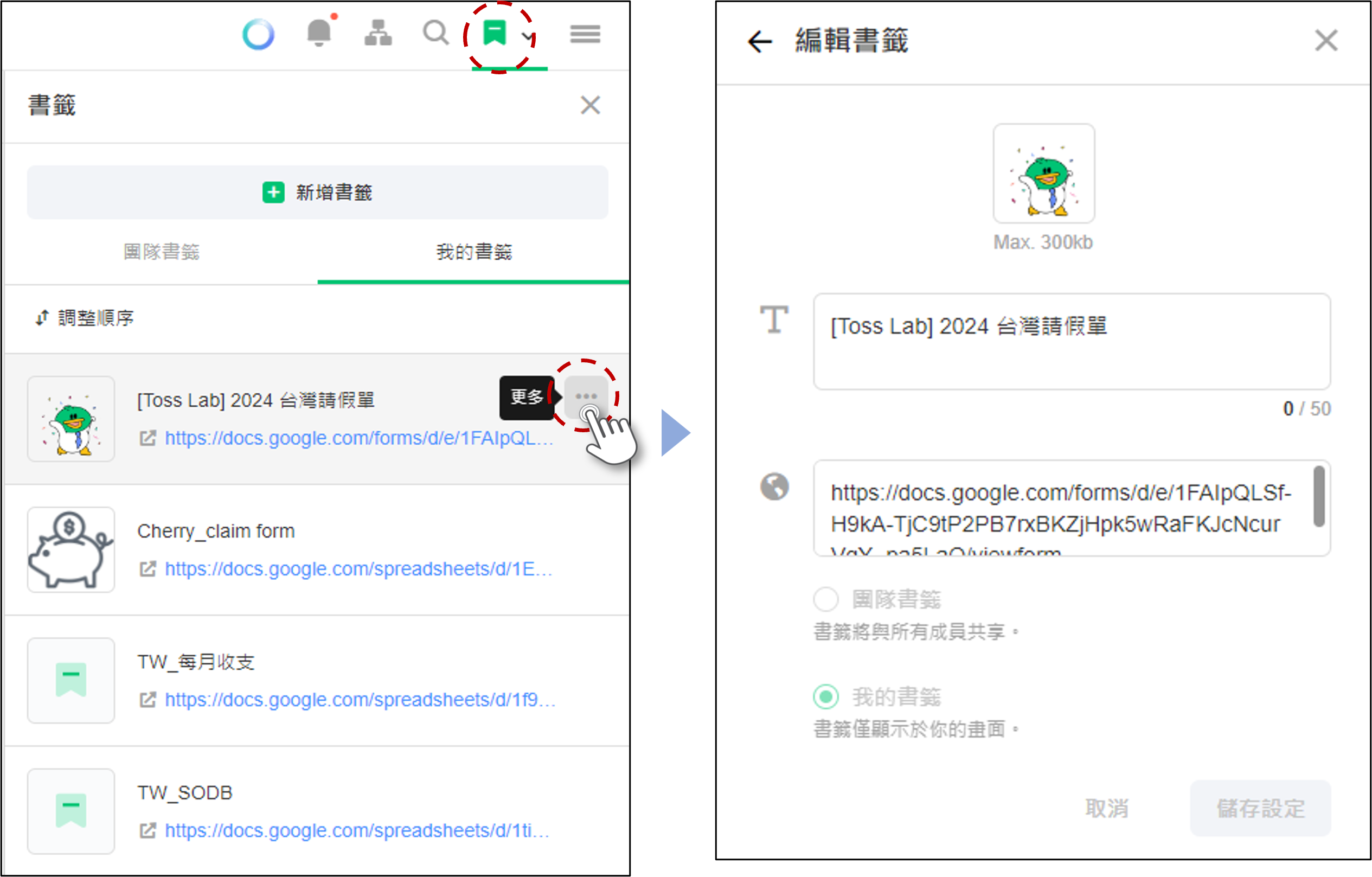 💡【操作方式】:书签的右上角[...更多] > [编辑] > 保存设置。