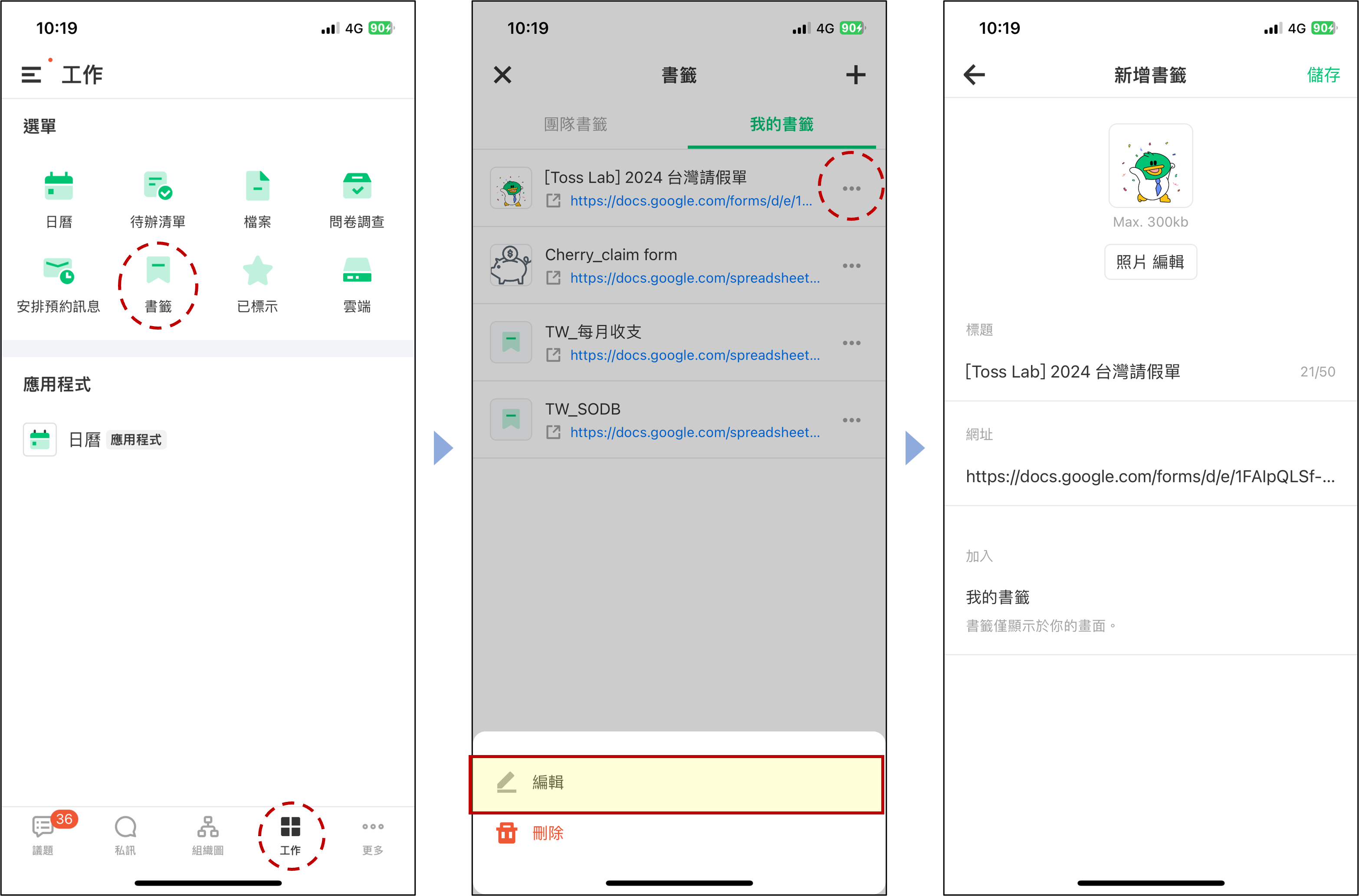 【操作方式】:界面底部工作 > [书签] > [...更多] > [编辑] > [保存]。