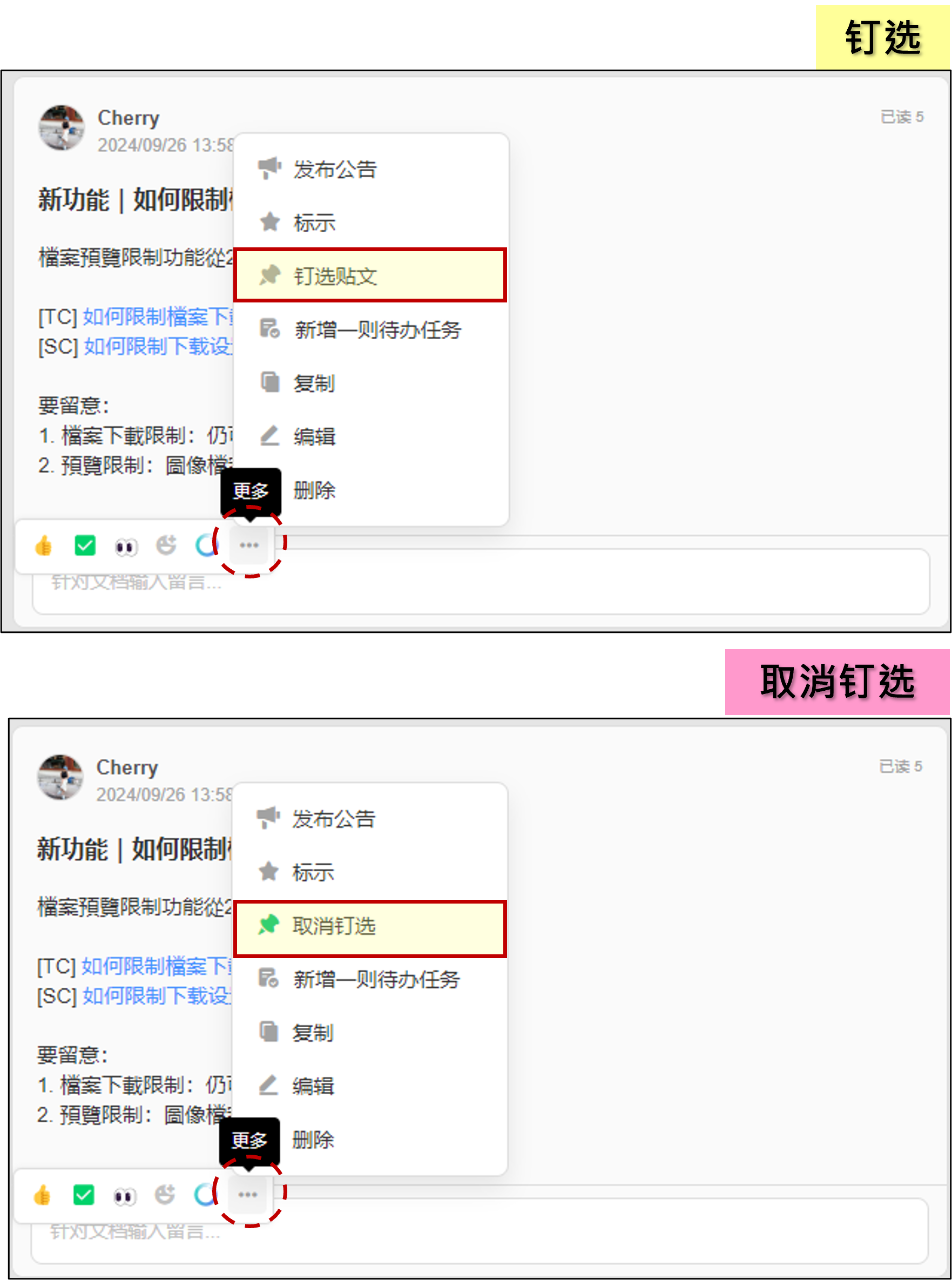 透过此功能,您可以将重要贴文钉选在议题顶部,轻松跳转到贴文。