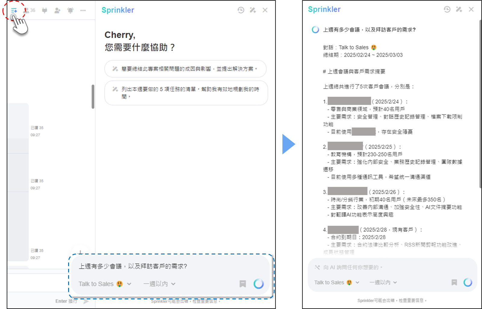「对话摘要」可快速整理 聊天室(议题 & 私讯)中的讯息内容,并根据对话内容提供关键摘要与回答。适用于 简化冗长对话、掌握核心资讯,让工作沟通更高效!