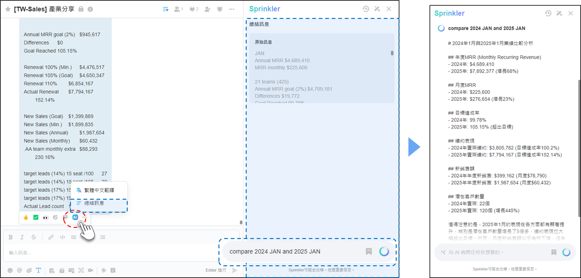 『总结信息』与『总结文档』 功能,让 AI 帮助您快速解析单则信息或文档内容,并根据您的需求进行分析、编辑、资料撷取与整理。